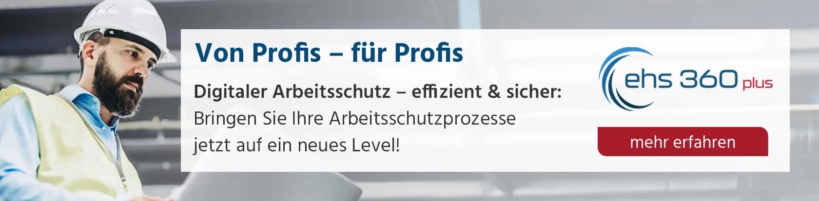Die webbasierte Lösung für rechtssicheres EHS-Management in Unternehmen jeder Branche. Ob Gefährdungsbeurteilungen, Gefahrstoffverzeichnis oder Sicherheitsunterweisungen: Mit EHS 360 plus bringen Sie Ihre Arbeitsschutzprozesse auf ein neues Level - effizient, Standort übergreifend und 100% digital.